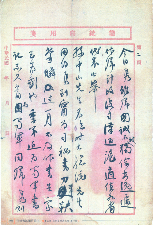 旧历十月自东京归,为蜀军事往武昌与黎都督商议一切,句留黄冈,曾驰书报告,乱历之际,不识得达。□□□不知吾家尚在酆邑否?闻酆邑反正之际,亦曾受兵,不识吾家中受危险否?念切种种。隽自到东后,即投身革命党中,幸赖同胞奔走之劳,得有今日。隽虽归国,诚不敢独偷安逸,遽作归计,故复自汉返沪。适值各省代表公举孙中山先生为临时大总统,先生因约隽到宁,为司秘书,刀笔鞅掌。瞬过一月,不及作书告家,至为歉也。季弟近为蜀军书记,不久当与蜀军同归。隽则一时尚难托身,但俟和议告成,南北两政为合并时,或可遂吾归家之愿耳。通信可寄“南京大总统府书处”,或“上海东百老汇路一百三十四号蜀军交通部事务部转交”亦无不可。