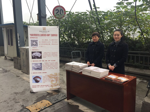 2018年元旦假期的第一天,我馆为深入贯彻党的十九大关于“坚定文化自信,推动社会主义文化繁荣兴盛”的要求,在朝天门7码头开展“传承优秀传统文化 弘扬历史名人精神”公益宣传活动,丰富群众的节日文化生活。