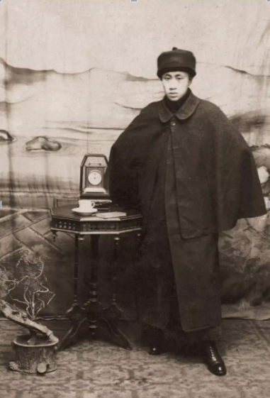 梁漱溟1906年考入顺天中学堂,学习国文、英文及数理化等,因同学甄元熙介绍,开始参加革命活动。毕业前参加了同盟会京津支部,从事推翻满清的秘密活动,“亦闹了些手枪炸弹的把戏”。图为1911年于顺天中学高等学堂毕业,特借长兄方留日归来所带回日本大学生的服装鞋帽留影纪念。