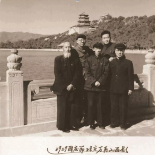 1959年国庆节于北京万寿山,梁漱溟与陈亚三(前排左一)、李渊庭(前排右一)、黄艮庸(后排左一)等合影。