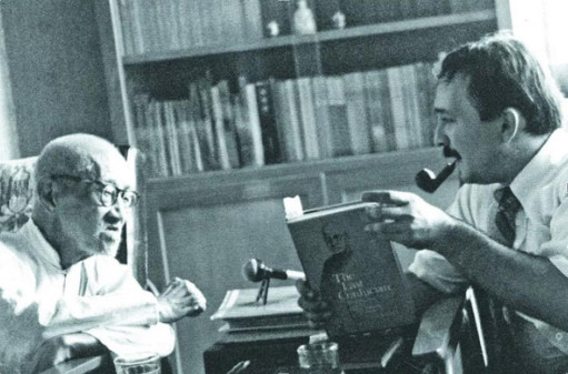 “文革”结束,国家拨乱反正,社会重新走入正轨。1979年底,梁漱溟移居木樨地复兴门外大街22号高干楼,在此安度晚年。图为1980年8月,梁漱溟与来访的美国芝加哥大学教授、《最后的儒家》作者艾恺谈话留影。