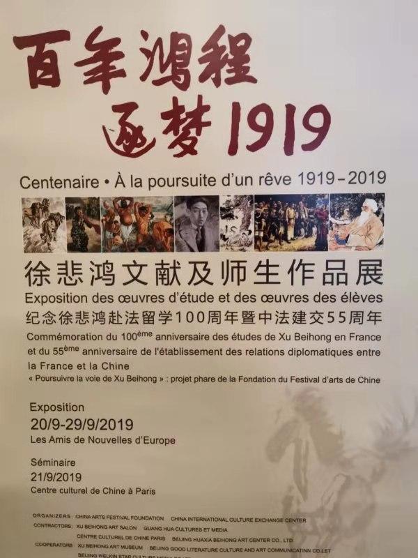 在中华人民共和国成立70周年、中法建交55周年之际,由中国艺术节基金会、中国国际文化交流中心主办,北京徐悲鸿纪念馆、北京华夏悲鸿艺术中心参与合作,徐悲鸿艺术沙龙、法国欧洲时报文化传媒集团、巴黎中国文化中心共同承办的“百年鸿程·逐梦1919——徐悲鸿文献及师生作品展”于9月20日在法国巴黎欧洲时报文化中心举办。