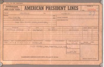 这是一张1947年的船票,纵13.3厘米,横21.8厘米。船票内容为:日期1947年11月26日,持票人潘豫,年龄62岁,从上海到香港乘坐美国总统轮船公司戈登将军号,金额65美元。右下角还有圆形蓝色盖章。现藏于浙江省嘉兴市南湖革命纪念馆,为国家三级文物。