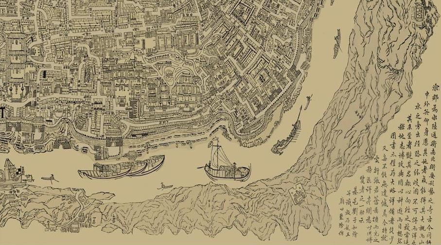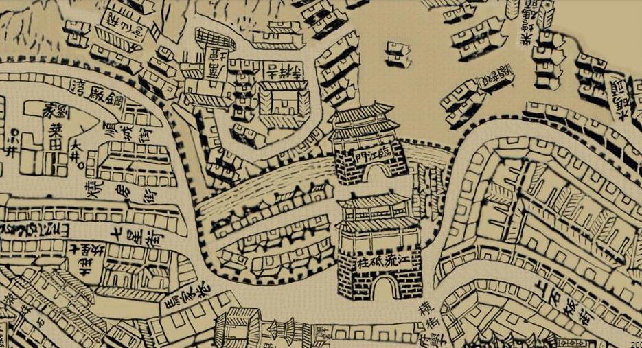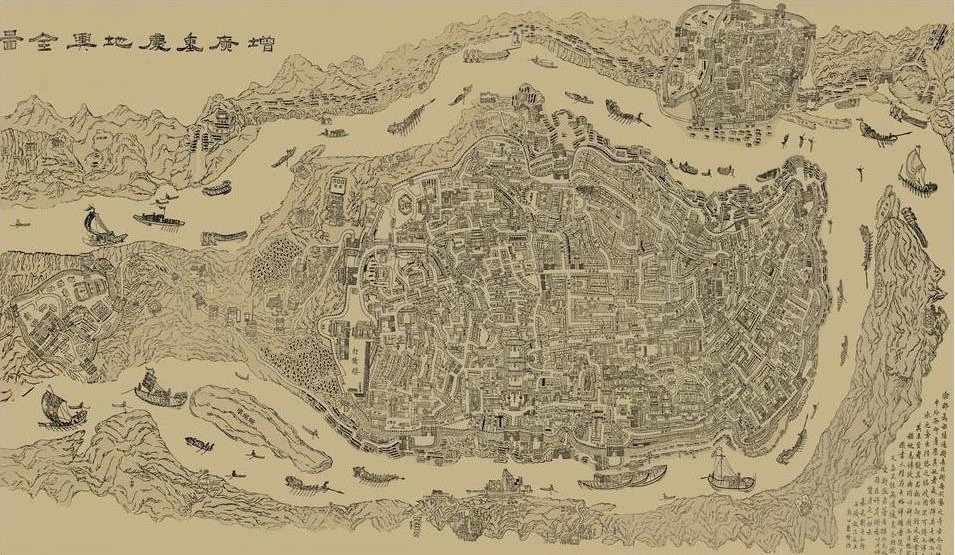 《增广重庆地舆全图》属写意性木刻,长151.5厘米*宽85.5厘米。该图约雕刻于1898年至1902年间,详尽描绘了一百多年前以重庆渝中半岛为中心的重庆古城的地貌及街市,东起朝天门,西至浮图关,南至长江以南的今南岸区一线,北括江北城观音桥一线。地图采用了手绘、木刻的方式,以俯瞰的视角画街道、河流,又以正面的视角画房屋、建筑,具有古地图多视角、凭记忆描绘的特点。