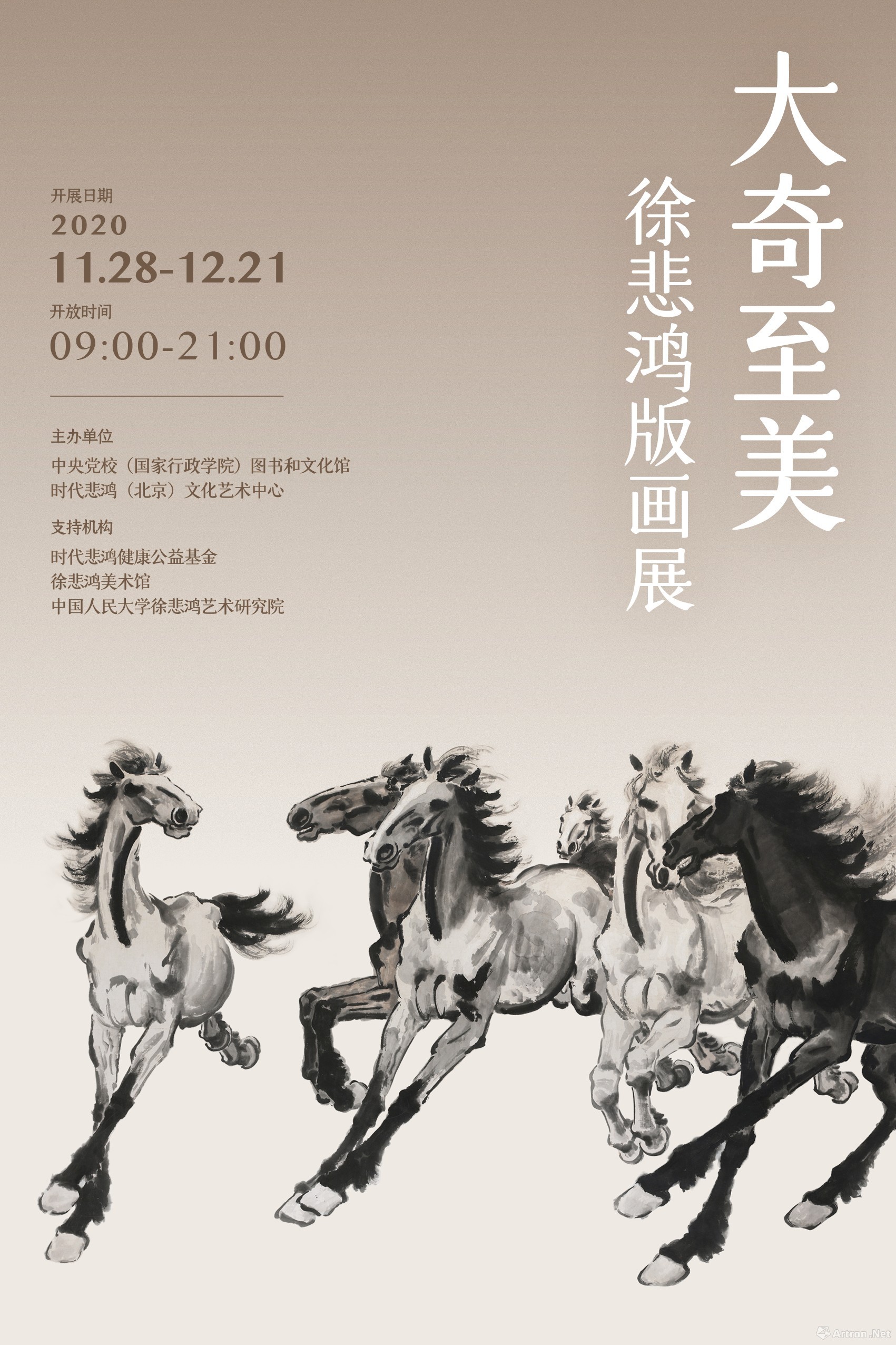2020年11月28日,“大奇至美:徐悲鸿版画展”在中共中央党校(国家行政学院)北校区美育馆开幕。展览由中共中央党校(国家行政学院)图书和文化馆、时代悲鸿(北京)文化艺术中心主办,时代悲鸿健康公益基金、徐悲鸿美术馆、中国人民大学徐悲鸿艺术研究院等机构提供支持。