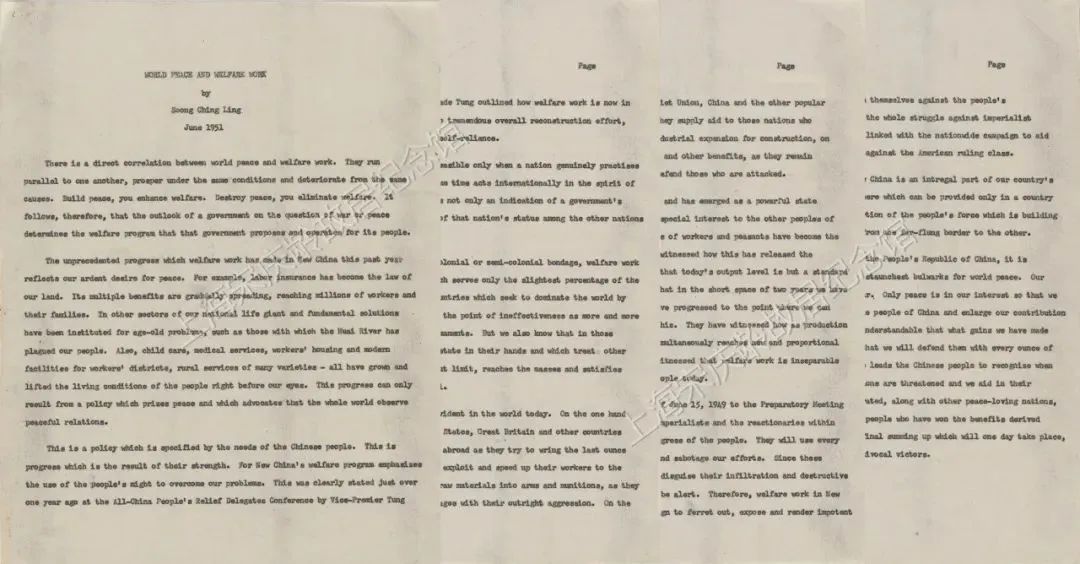 1952年1月,宋庆龄为《中国建设》创刊号撰写的《福利事业与世界和平》一文,上图是文章底稿,文章阐明:“世界和平与福利事业有着直接的关联。两者是相辅而行的,可以在同样的条件下发展起来,也可以因同样的原因而受到危害。”“福利事业在新中国所表现的空前进步,反映了我们对于和平的热切愿望。”并指出中国是保卫世界和平的坚强堡垒。