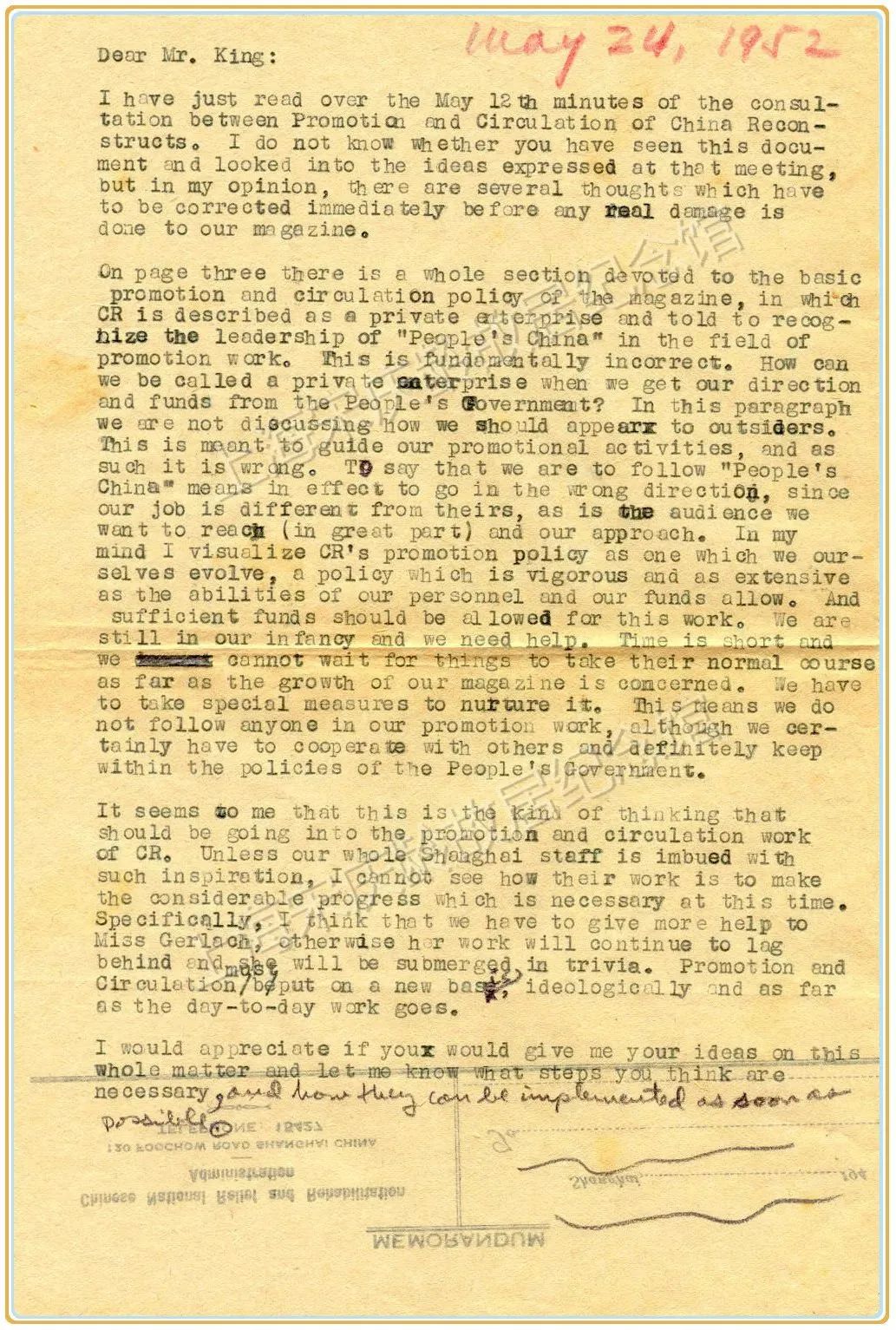 1952年5月24日宋庆龄致信《中国建设》杂志社社长金仲华,商议《中国建设》的宣传推广和发行工作。信中指出必须立即纠正《中国建设》宣传推广部门和发行部门之间磋商的会议记录中所表达的部分观点,指出《中国建设》的宣传推广不跟从任何人,应在自己的人员能力和经费允许范围内尽可能制定有力而广泛的宣传推广政策。