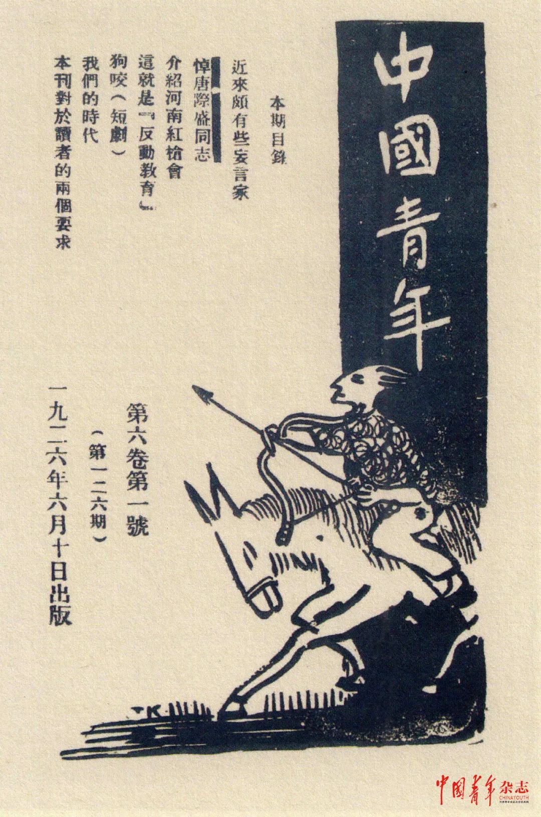 接着,在1926年6月的《中国青年》第126期封面上,再一次出现了丰子恺的画,与上次不同,这次画面回到了射箭矢志的人物,一个青年战士骑在一匹战马上,意气风发,挽弓搭箭,准备发射。