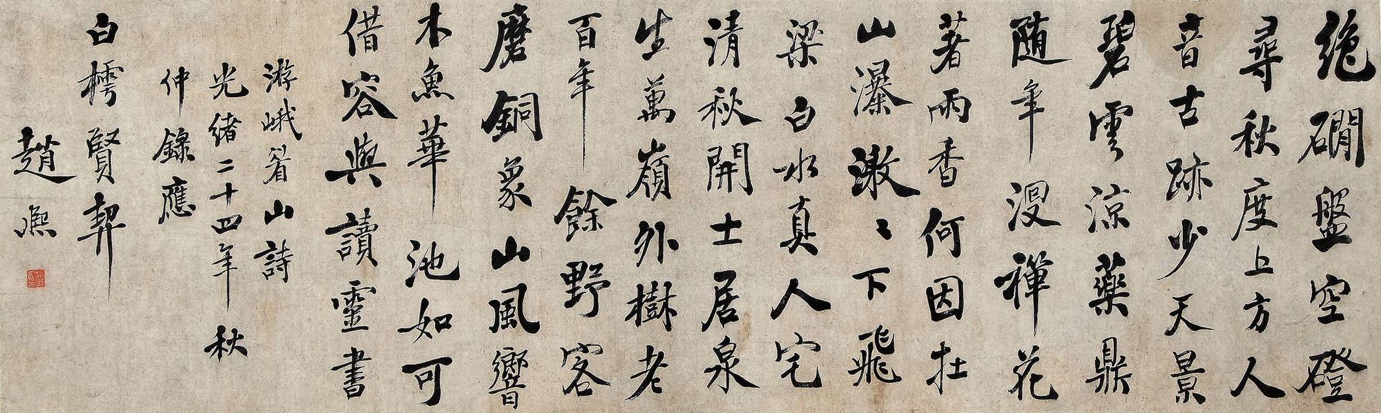 赵熙(1867—1948),四川荣县人,著名诗词家、书法家。光绪十八年(1887年) 进士,殿试后入翰林。曾任翰林院庶吉士、重庆府主考、川东书院山长。他培育了吴玉章、黄复生等著名历史人物。在四川保路运动中,专折请严惩赵尔丰。远在日本的梁启超也尊他为师。辛亥革命后,徙居重庆浮图关下“礼园”(今鹅岭公园),备受当时蜀军政府要员的盛情款待。1928年,由他总纂的《荣县志》成书。抗战时期在重庆反对内战,1941年拒绝蒋介石恭请,不出任国民政府高级顾问。赵熙不仅胸怀正义,泾渭分明,而且学富五车,著有《香宋词》《香宋诗前集》《北游集》等诗词集,其书法造诣极高,融各家之长,成自家风格,人称“荣县赵字”。其所作川剧《活捉王魁》《除三官》《焚香记》 等,尤为群众喜爱。他长期寓居重庆,留下不少描绘重庆山川名胜的诗词。