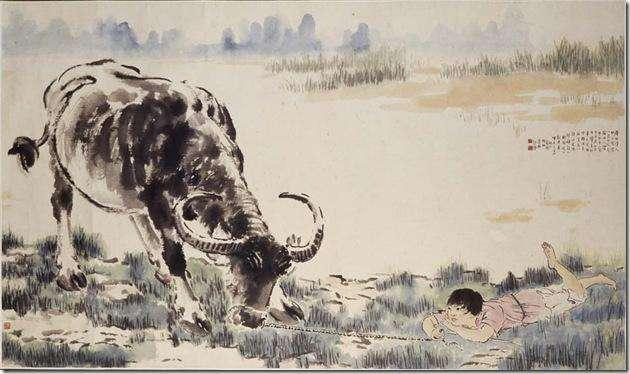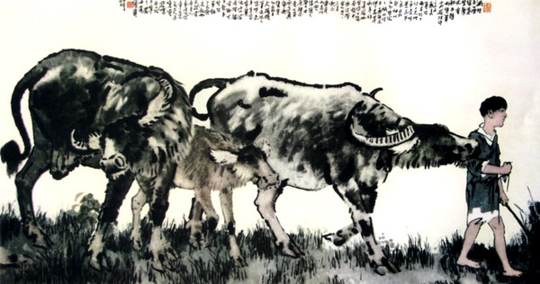 《牧童》,56cm×83cm,创作于1941年。现实的外界炮声隆隆、硝烟弥漫,而画中则是风光旖旎、人畜相亲、安静祥和。牧童牵着倔强的耕牛,一起向远处眺望着,整个画面动中有静、静中藏动。从此画可看出,或许因为暂时远离了烽火炮声的喧嚣,难得片刻的安宁,画家创作时的心情是愉快的。