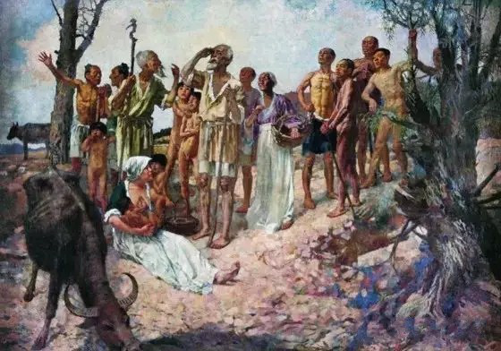 《徯我后》,230cm×318cm,创作于20世纪30年代初。该画取材于《书经》,“徯我后,后来其苏”意为“等待我们贤明的领导人,他来了,我们就得救了”。画面描绘大地干裂,瘦弱的耕牛啃着树根,一群穷苦的老百姓在翘首瞭望远方,眼睛里燃烧着焦灼的期待。徐悲鸿借这个题材抒发了苦难的中国人民渴望得到解救的心情。