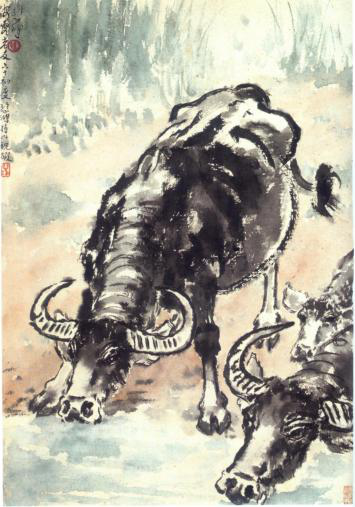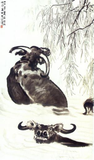《牛浴》,130cm×75cm,创作于1938年。1938年7月,徐悲鸿离开重庆,欲往新加坡举办画展宣传抗战,筹集款项。由于此前为避免敌机轰炸,徐悲鸿将自己的全部作品存放在桂林七星岩岩洞内,这次要携带一部分作品出国展览,遂先往桂林取画。后因广州沦陷而滞留桂林。《牛浴》就是他在桂林滞留时创作的一幅写生画。