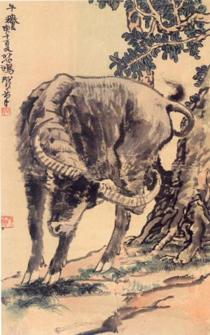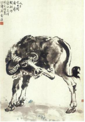 《牛痒》,87.5cm×54cm,创作于1930年。“牛痒,庚午夏悲鸿戏笔”,由款识可见画家的轻松惬意。这是徐悲鸿现存画作中创作较早的一幅“牛”。