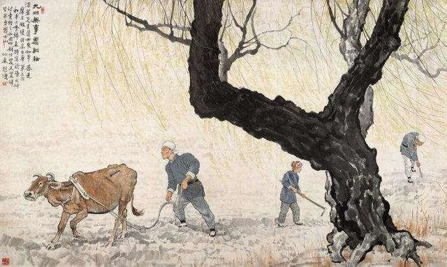 《九州无事乐耕耘》,150cm×250cm,创作于1951年,是徐悲鸿晚年代表作之一。当年,郭沫若出席“第三次保卫世界和平大会”,并在莫斯科克里姆林宫被授予“ ‘加强国际和平’斯大林金质奖章”。徐悲鸿闻讯欣喜万分,抱病绘制了这幅巨作,赠与郭沫若。画题取自欧阳修《寄秦州田元均》中“万马不嘶听号令,诸蕃无事乐耕耘”的后一句,且把“诸蕃”改为“九州”,颇具匠心。作品款识表明其创作目的——“沫若先生为世界和平奔走,席不暇暖,兹届出席第三次和平大会归来,特写欧阳永叔诗意赠之”,同时也表达了画家对和平的热望。